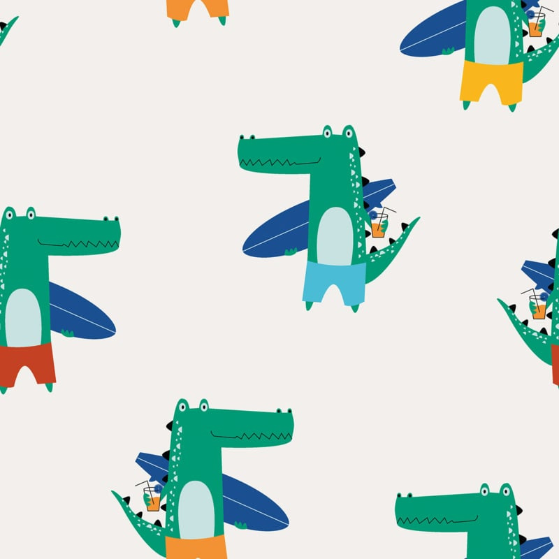 Surfende krokodilEen vrolijk zomers printje deze stof, met krokofillen en een surfbord.
