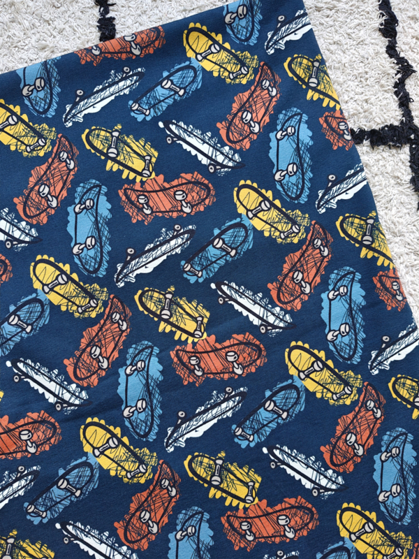 SkateboardEen lekker stoer stofje voor jongens! Mooie kleur blauw met hierop in diverse kleuren een print van skateboards. Tricot stof, vooral mooi voor t-shirt, longsleeve en leggings/harems.