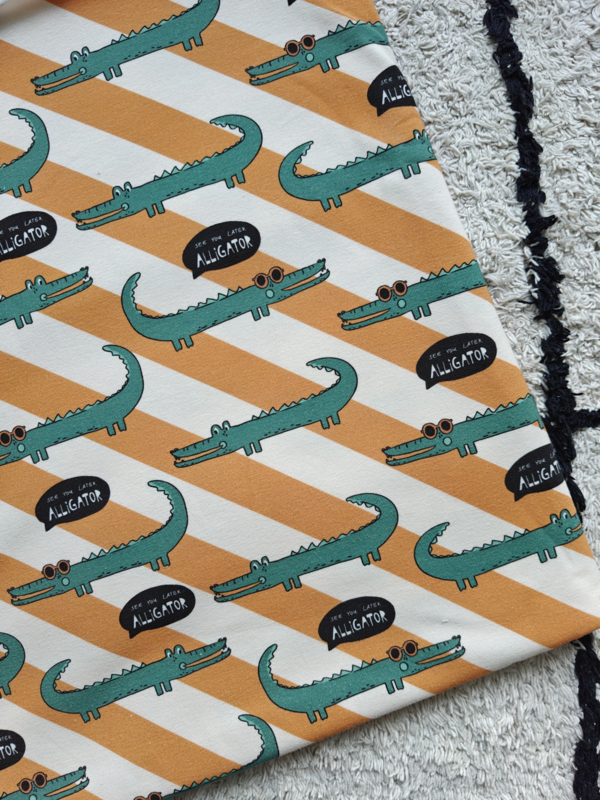 AlligatorEen vrolijk printje met alligators en een frisse kleur okergeel. Tricot stof, heel mooi voor t-shirts, longsleeves en broekjes!