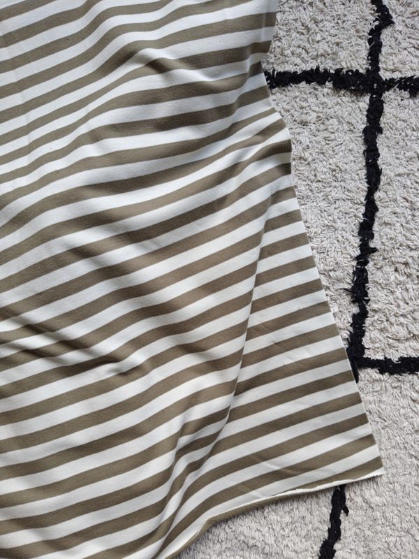 Streep olijfEen basic stofje maar heel mooi en tijdloos! Kleur is olijfgroen, minder hard dan de afbeelding. French terry stof dus inzetbaar voor vele (basic) kledingstukken. Maar ook leuk om een twist eraan te geven door bijvoorbeeld een…