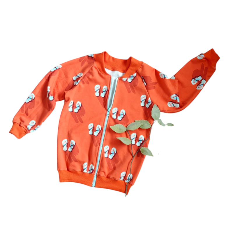 Een heerlijk zomers printje! Het vest zelf heeft ook een heerlijk kleurtje, waar je gelijk blij van wordt. De rits heeft een blauwe matchende rits van de slippers. Voor nu 1 stuk op voorraad, maat 104, valt ruimer, zeker langer…